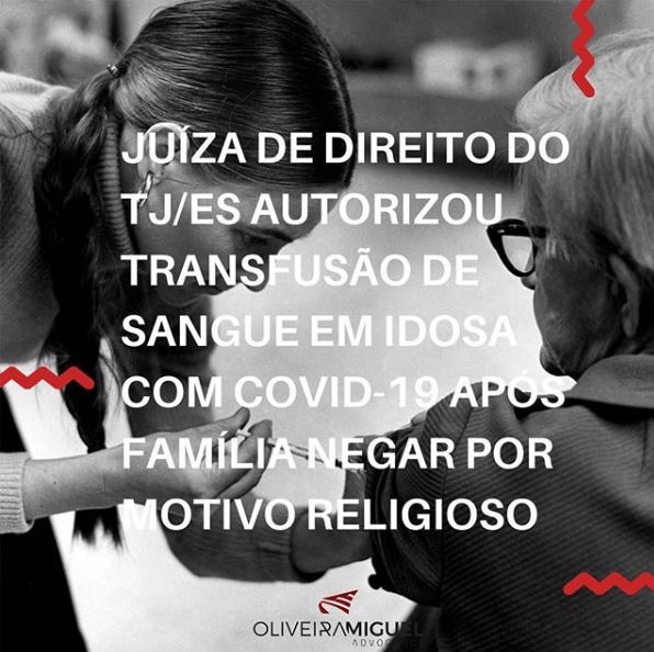 TJ/ES: Juíza autoriza transfusão de sangue em idosa com covid-19 após família negar por motivo religioso